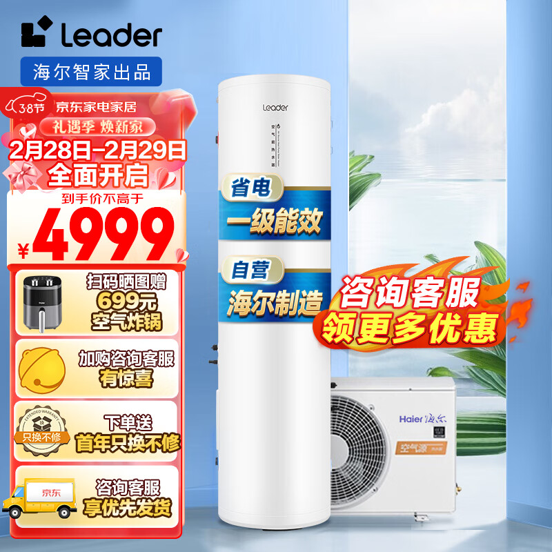海尔(Haier)出品Leader空气能热水器200升一级能效WiFi电辅80℃杀菌洗节能效率420%京东小家1.0H (4-6人)价格:4801.90元!