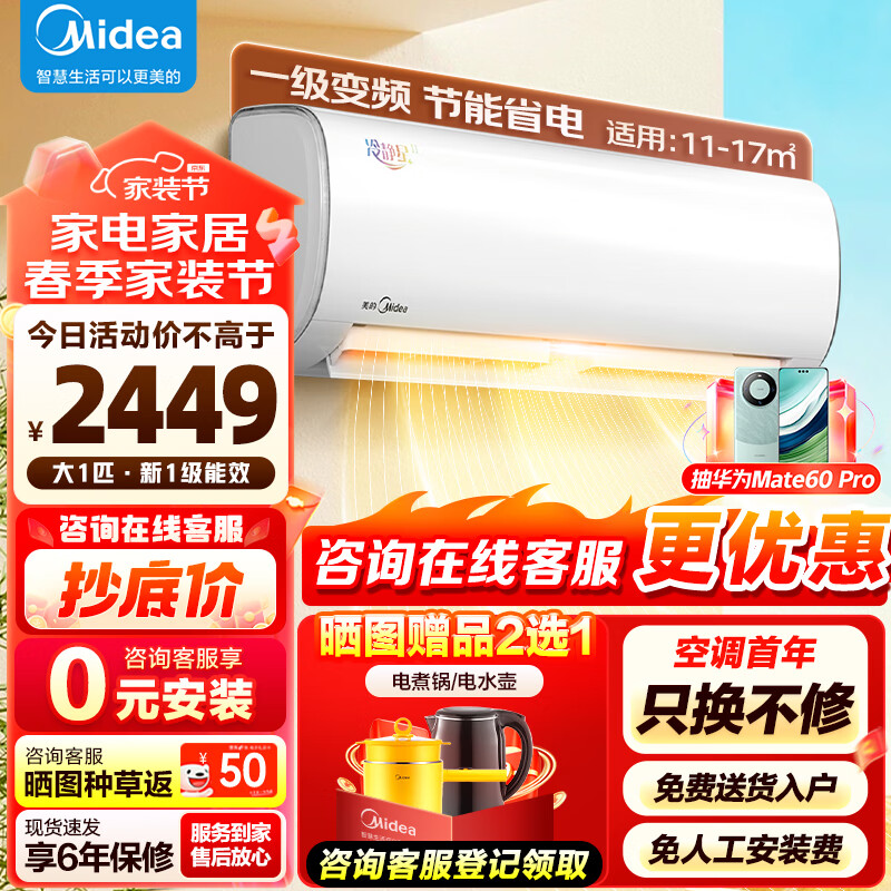 美的(Midea)空调大1匹挂机 冷静星二代 新一级能效 变频冷暖 壁挂式 KFR-26GW/BDN8Y-PH200(1)A卧室书房空调价格:2549.00元!