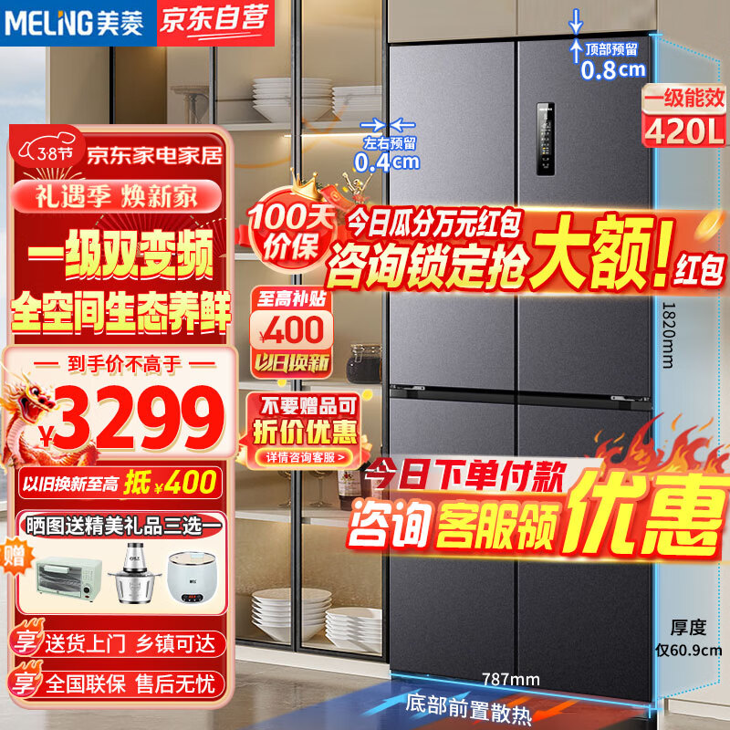 美菱(MeiLing)420升十字对开冰箱四开门多门一级双变频超薄嵌入式风冷家用底部散热电冰箱 BCD-420WP9CZX 神秘灰价格:3599.00元!