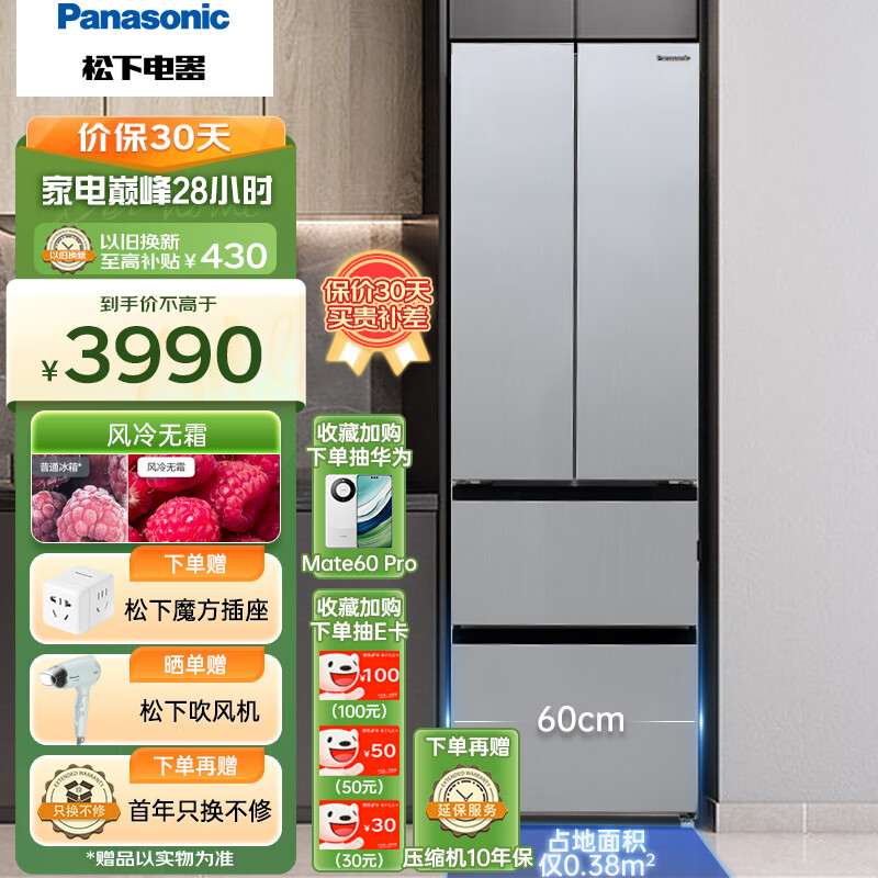 松下(Panasonic)400升四门法式超薄冰箱 银离子 60cm宽占地小 风冷无霜优选NR-ED40WPA-S冰河银【以旧换新】价格:3990.00元!