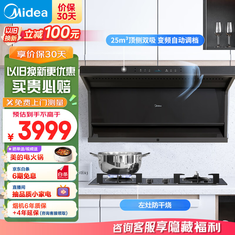 美的(Midea)抽油烟机燃气灶具 家用顶侧双吸25风量大吸力变频高压水洗 防干烧燃气灶烟灶套装DC9+36S天然气价格:3999.00元!