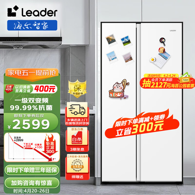 Leader 海尔智家出品618升超大容量风冷无霜白色对开门双开门一级能效家用变频电冰箱BCD-618WGLSSEDW9价格:2899.00元!