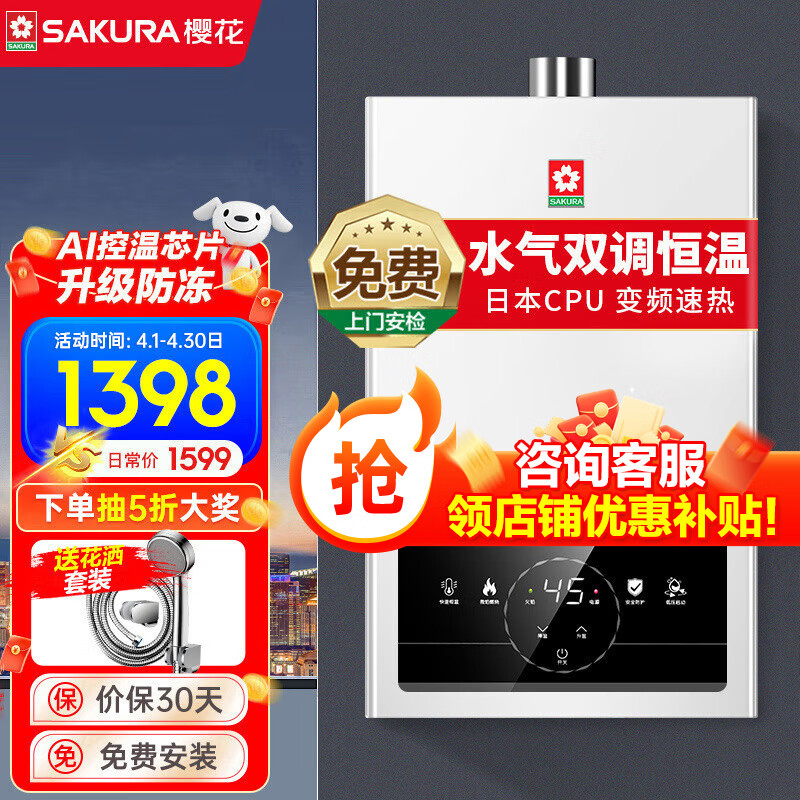 樱花(SAKURA)燃气热水器水气双调智能精控恒温直流变频降噪触控强排式热水器低压启动多重防护 16L NJP007AS防冻款价格:1699.00元!