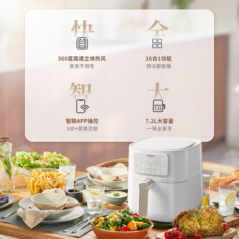 飞利浦(PHILIPS)全新智控空气炸锅 7.2L大容量智能烹饪 精准控温不用翻面 APP菜谱多功能烤箱一体HD9285价格:999.00元!