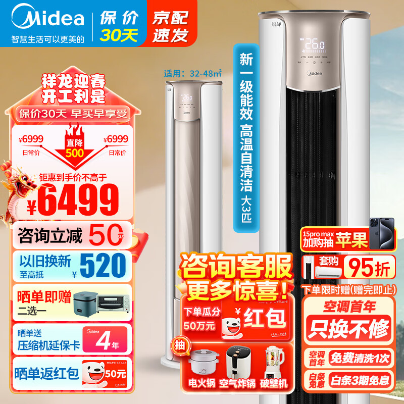 美的空调3匹 锐静 新一级能效 变频冷暖 智能空调柜机 大出风口立柜式客厅空调KFR-72LW/N8VHC1Ⅱ价格:6499.00元!