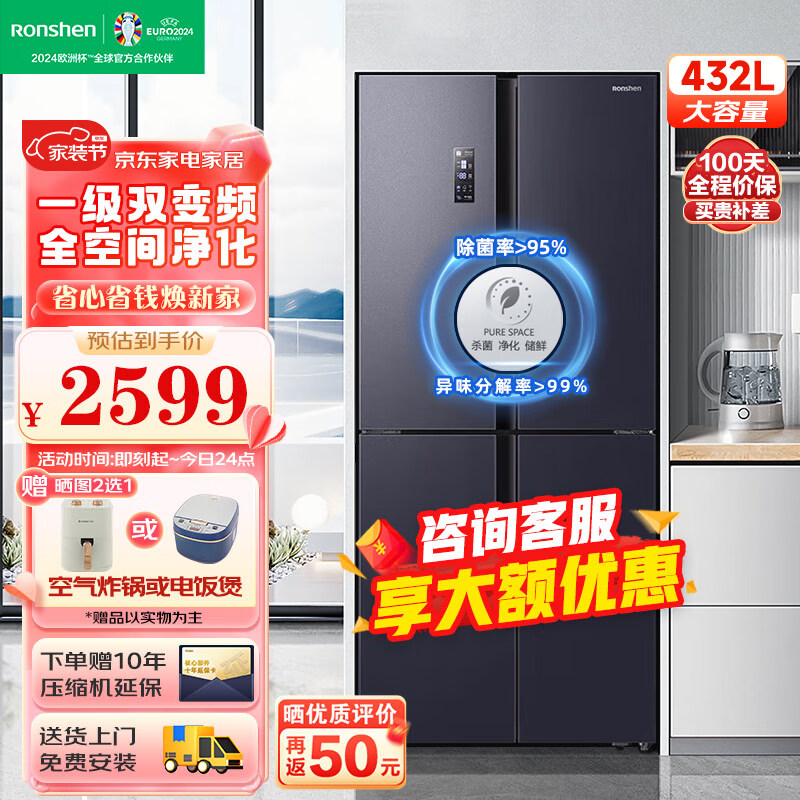 容声(Ronshen)冰箱 432升变频一级能效十字对开门四门冰箱家用风冷无霜大容量 BCD-432WD13FPA价格:2899.00元!