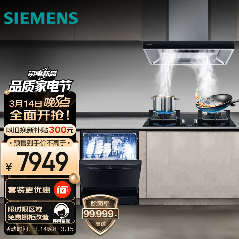 西门子厨电套装 14套大容量家用洗碗机 吸油烟机灶具套装(天然气) SJ23HB66KC+951W+ER7JGA23MP价格:7949.00元!