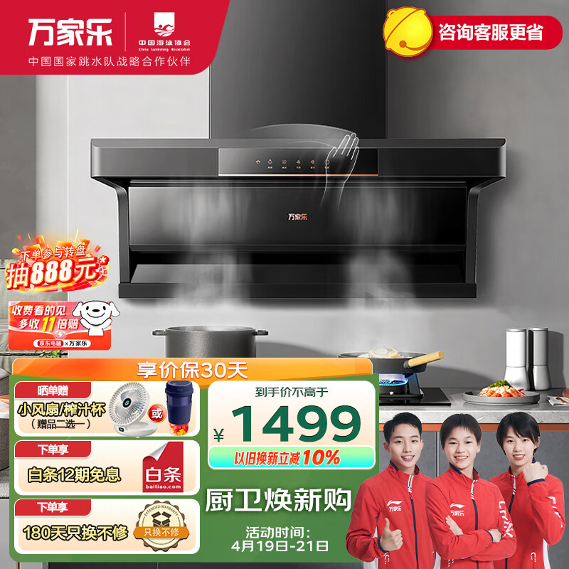 万家乐 抽油烟机 顶侧双吸油烟机 22m3/min爆炒大吸力 7字型家用自清洗 挥手感应单烟机CXW-320- AK5价格:1474.00元!
