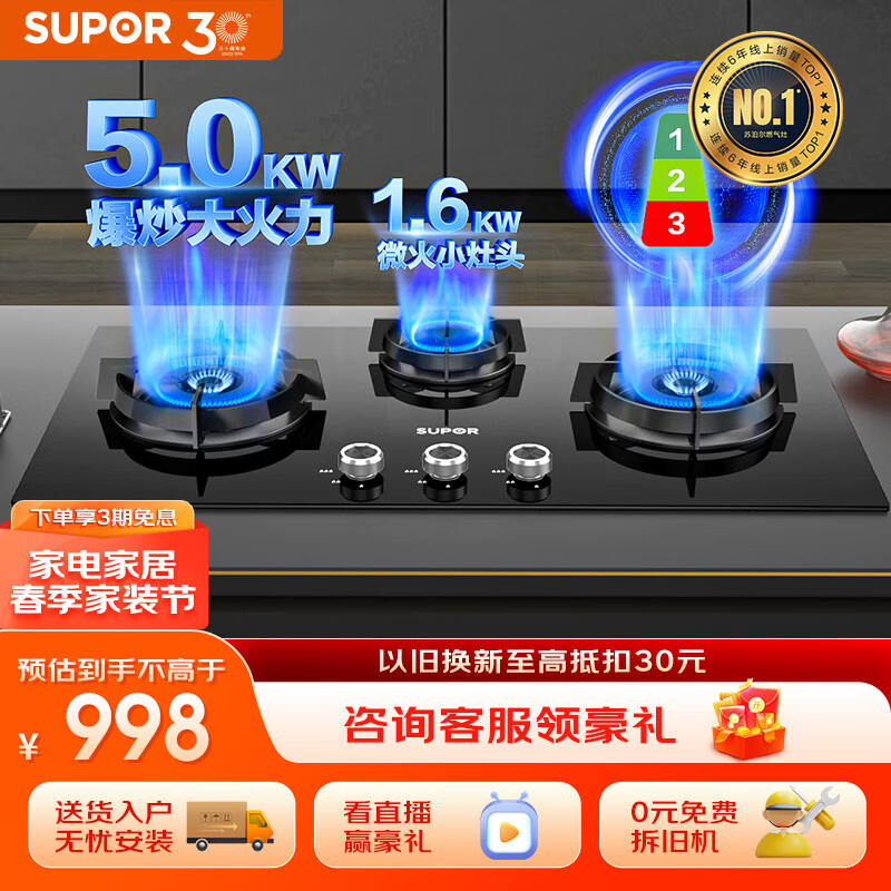 苏泊尔(SUPOR)燃气灶家用天然气灶 台嵌两用三眼灶具 5.0kW大火力 三区烹饪黑晶面板 DB82燃气灶价格:998.00元!