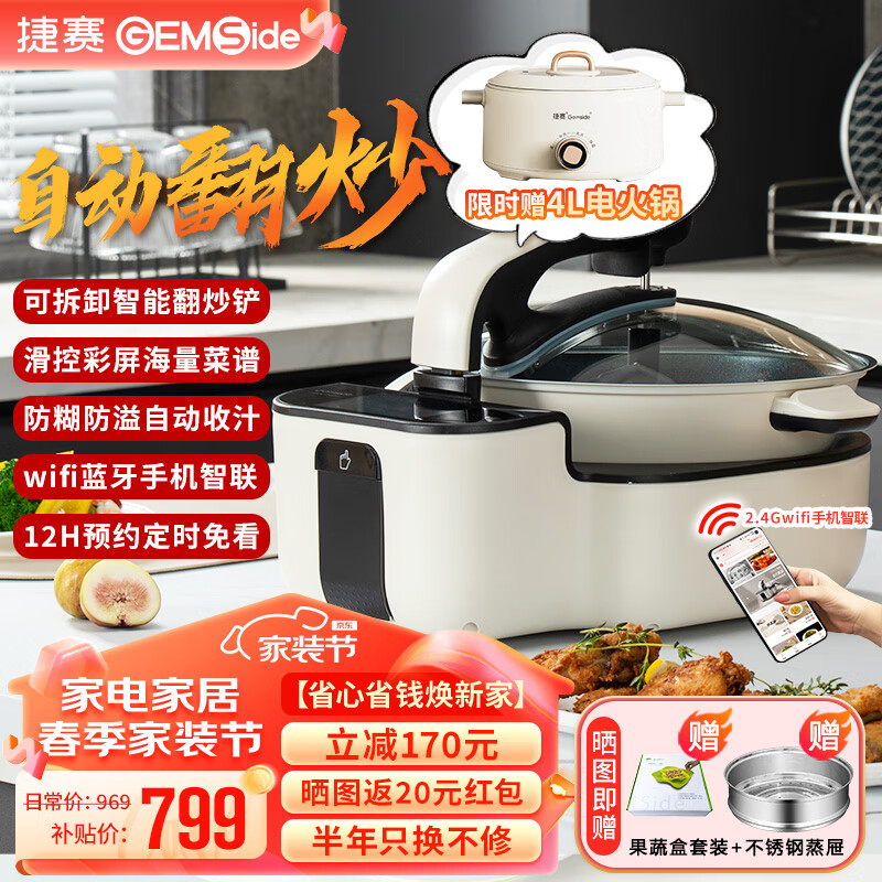 捷赛全自动智能炒菜机 多功能智能烹饪锅家用自动炒菜机器人无油烟不糊锅可定时预约LWOK-DW30米白价格:799.00元!