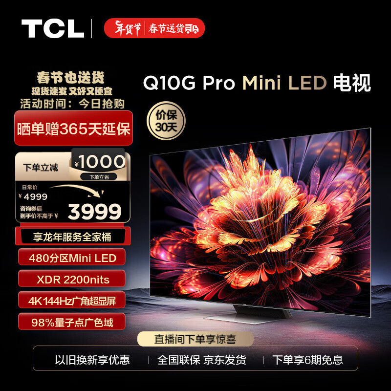 TCL电视 55Q10G Pro 55英寸 Mini LED 480分区 2200nits 4K 144Hz 2.1声道音响 平板电视机 以旧换新 55英寸 官方标配价格:4999.00元!
