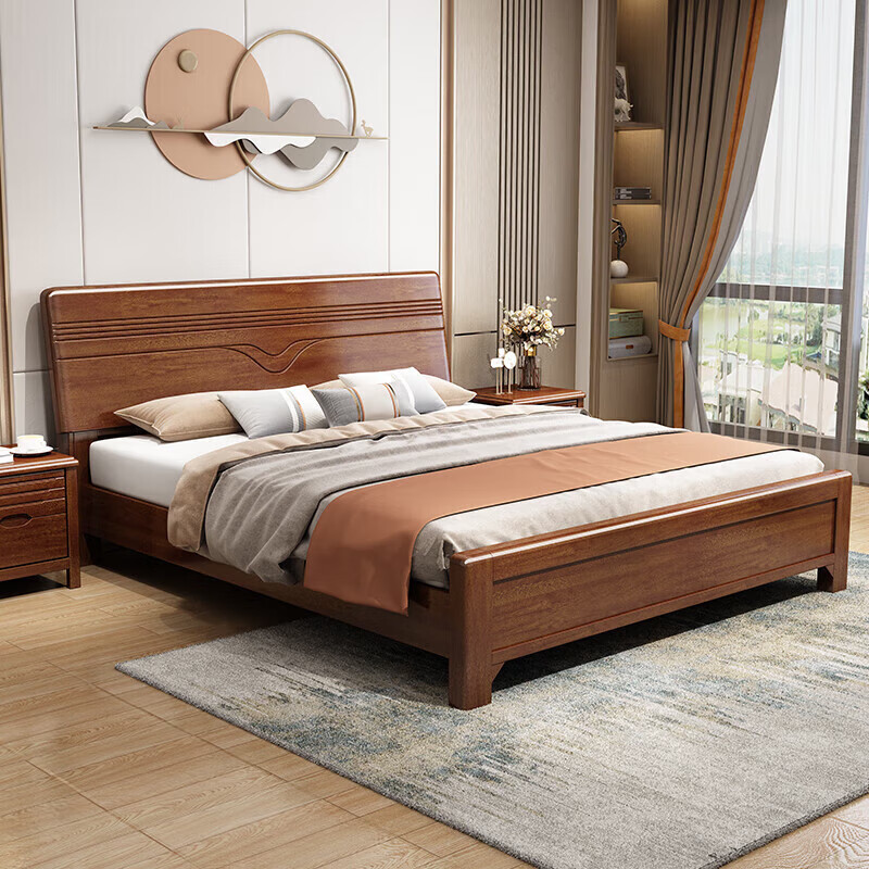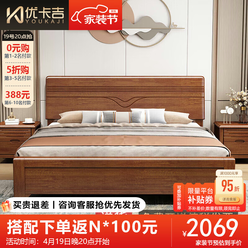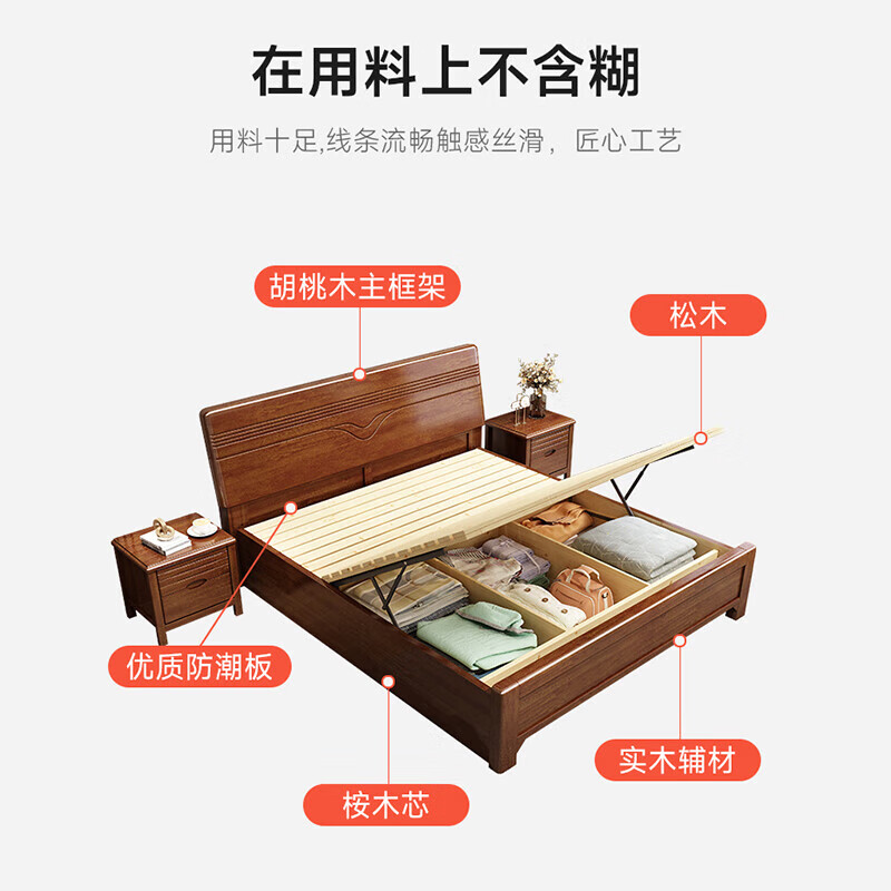 优卡吉胡桃木实木床新中式双人1.5/1.8米储物668# 1.5米箱框床+10cm棕垫价格:2599.00元!