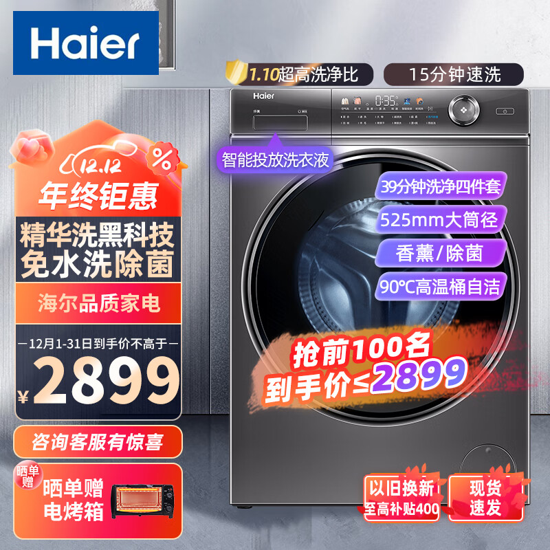 海尔(Haier)【精华洗】10KG全自动变频滚筒洗衣机家用大容量大筒径智能投放+香薰除菌+晶彩屏XQG100-BD14326L价格:2899.00元!
