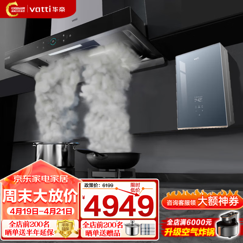 华帝(VATTI)油烟机 欧式抽油烟机燃气灶套装家用三腔变频.创世S7自动清洗24立方爆炒风量爆吸i11207厨房三件套 【省钱三件套】207+73B+12151恒温16L价格:4949.00元!