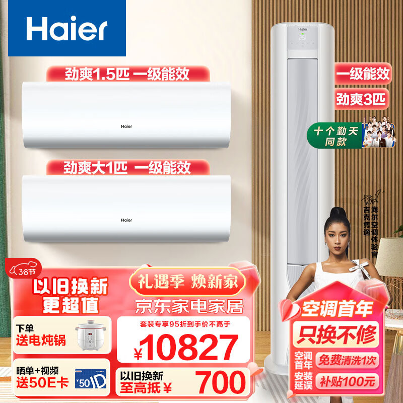 海尔(Haier)新一级变频 冷暖 壁挂式空调 劲爽空调 1.5匹挂+大1匹挂+3匹柜机 两室一厅套装价格:10732.00元!