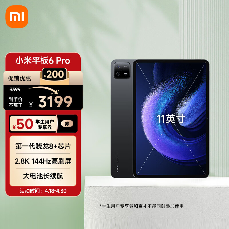 小米平板6Pro xiaomiPad 11英寸 骁龙8+强芯 144Hz高刷 2.8K超清 12+512GB 移动办公娱乐平板电脑黑色价格:3199.00元!