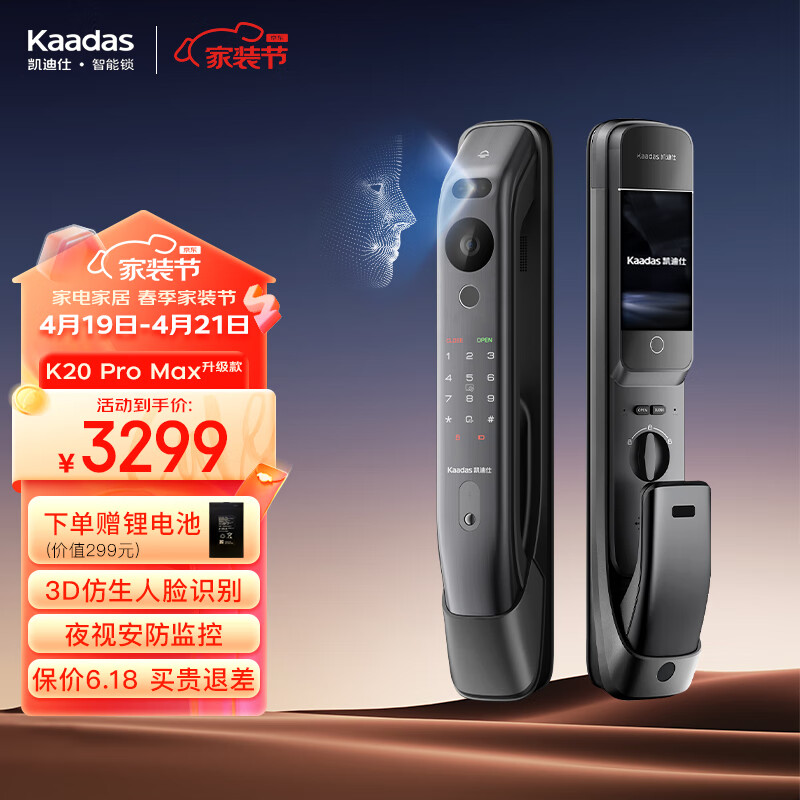 凯迪仕(kaadas)K20 Pro Max V2 指纹锁 智能门锁 3D人脸识别 大彩屏带摄像头监控价格:3699.00元!
