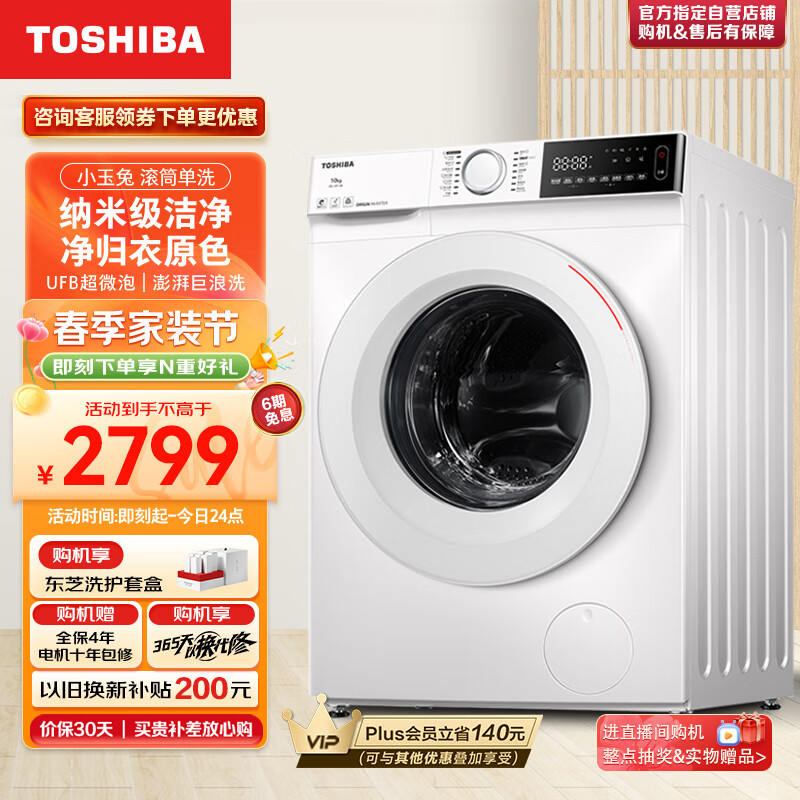 东芝(TOSHIBA)滚筒洗衣机全自动【小玉兔DG-10T13B】BLDC变频电机 10公斤大容量 UFB超微泡 以旧换新价格:2799.00元!