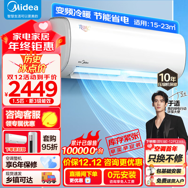 美的(Midea)空调1.5匹挂机 冷静星二代 新三级能效 变频冷暖 壁挂式 KFR-35GW/BDN8Y-PH400(3)A 卧室书房空调价格:2449.00元!