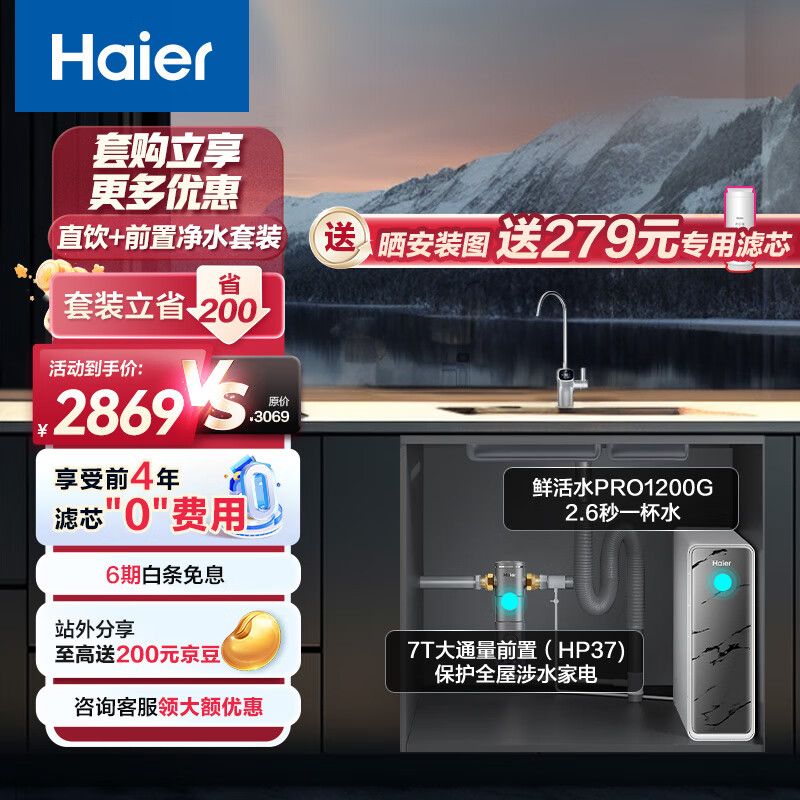 海尔(Haier)净水器1200G鲜活水pro家用净水机6年RO反渗透厨下直饮净水器+前置过滤器HKC3000-R793D2U1+HP37价格:2869.00元!