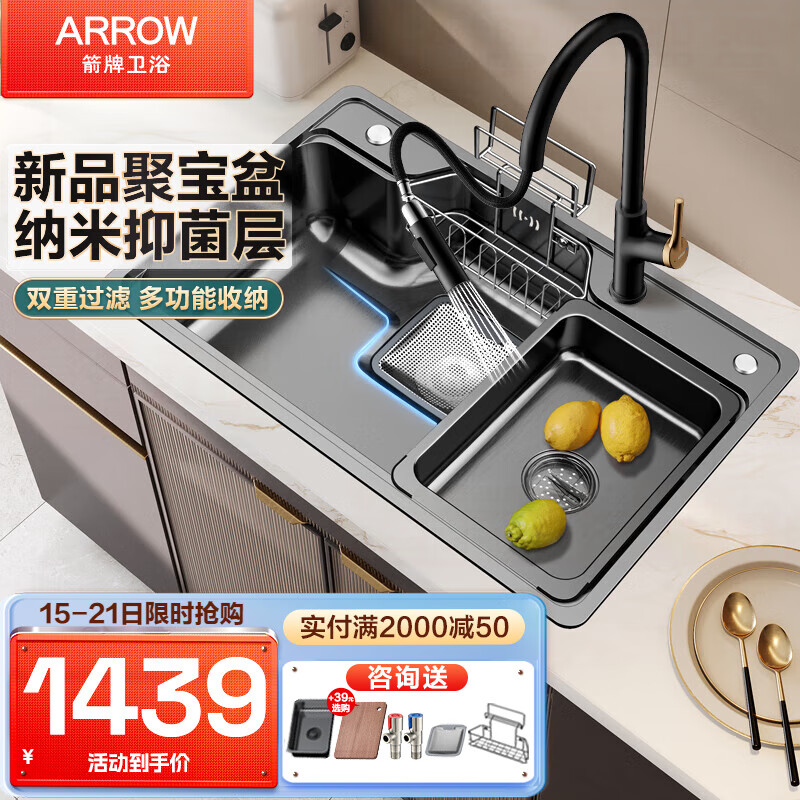 箭牌(ARROW)水槽聚宝盆304不锈钢一体洗菜盆加厚日式下收纳大单槽家用洗碗池 75*48多功能纳米单槽-配黑金龙头价格:1899.00元!