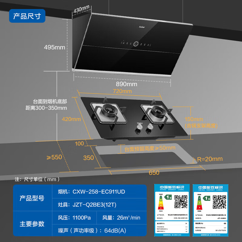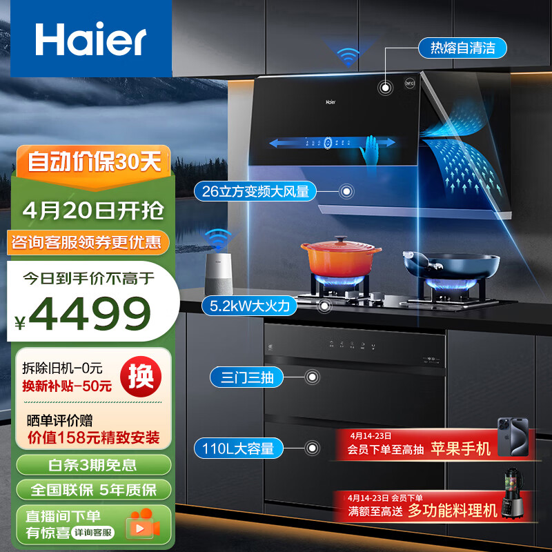 海尔(Haier)抽油烟机 烟灶消三件套 变频 26立方大吸力5.2kw大火力 110L三抽医疗级消毒柜EC911+Q2BE3天+EB031价格:4499.00元!