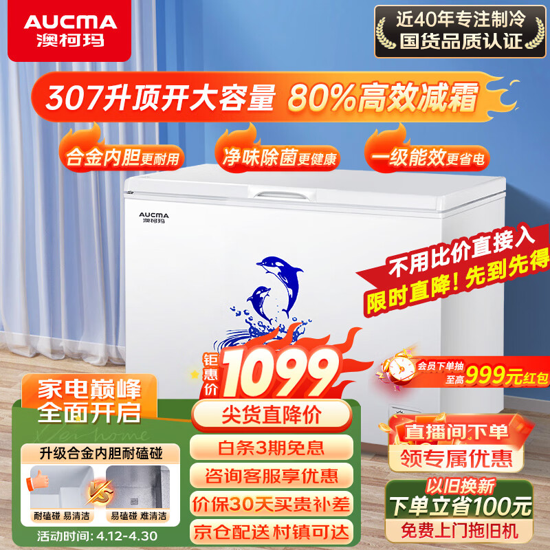 澳柯玛(AUCMA)307升低霜冰柜家用商用大容量冷藏柜冷冻柜转换 卧式冷柜冰箱雪糕柜一级能效以旧换新BC/BD-307HNE价格:1098.00元!