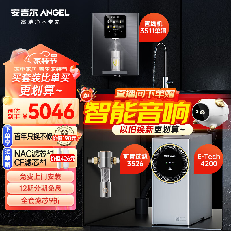 安吉尔净水器家用全屋净热套装前置过滤器管线机直饮RO反渗透E-Tech4200+前置3526+3511单温价格:5046.00元!