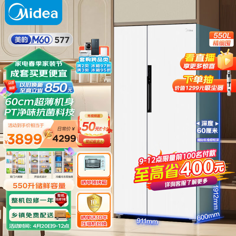 美的(Midea)M60系列60cm薄550升对开门双开门一级能效双变频家用风冷无霜白色电冰箱节能MR-577WKPZE超大容量价格:4799.00元!
