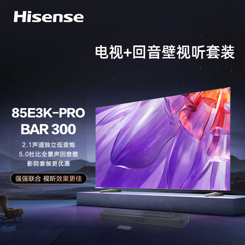 海信电视85E3K-PRO+BAR300沉浸追剧套装 85英寸 4K六重120Hz高刷 U+超画质引擎 液晶平板电视机价格:7797.00元!