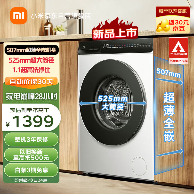 米家小米10公斤滚筒洗衣机全自动超薄全嵌机身525mm超大筒径1.1高洗净比直驱电机深层除螨XQG100MJ106价格:1399.00元!