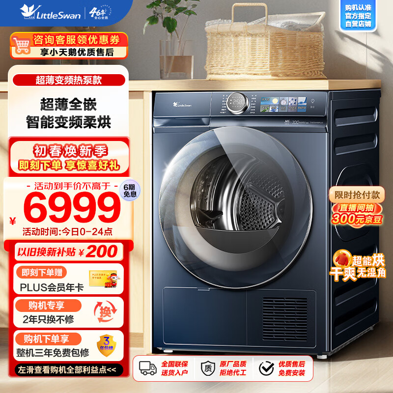 小天鹅(LittleSwan)10KG热泵烘干机 干衣机家用 变频大风量 超薄全嵌 羊毛蓝标 多重毛屑过滤 TH100VH88PLUS价格:6999.00元!