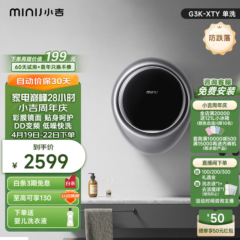 小吉(MINIJ)彩膜智慧大屏壁挂 迷你滚筒洗衣机全自动 DD直驱变频 专属母婴洗衣机 G3K-XTY价格:2599.00元!