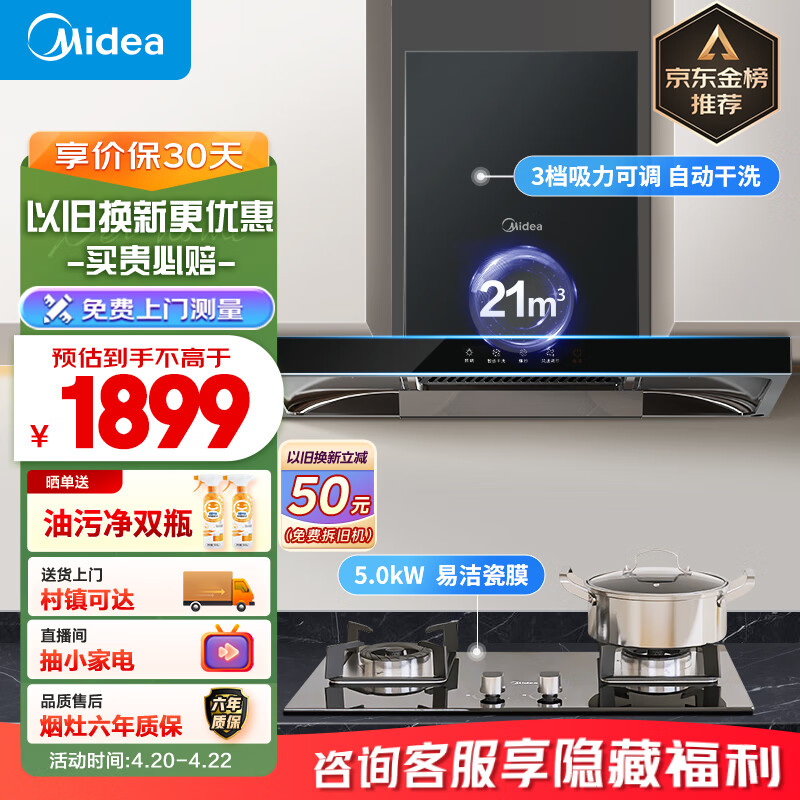美的抽油烟机灶具套装21大吸力自动清洗吸烟机燃气灶套装T201+Q330天然气价格:1899.00元!