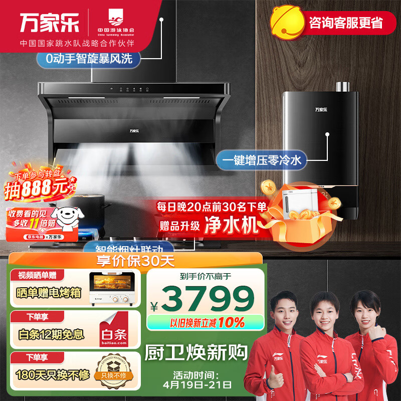 万家乐 抽油烟机 顶侧双吸油烟机 家用23m3/min厨卫烟灶热零冷水三件套装AK6+KV063B+16LDLU3天然气价格:3999.00元!