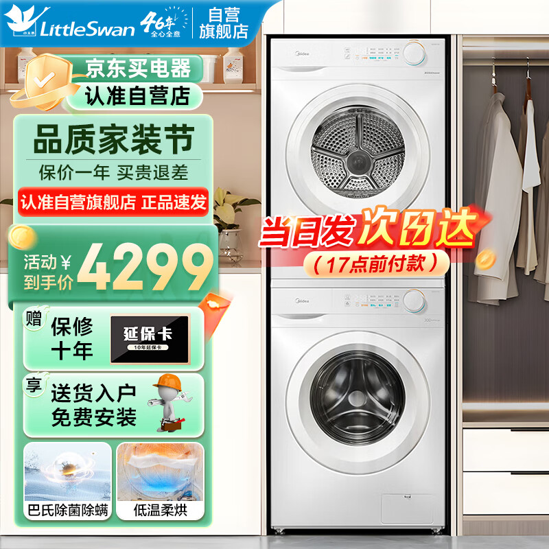美的(Midea)10公斤大容量 滚筒洗衣机+热泵烘干机 蒸汽除菌 热泵柔烘 白色洗烘套装MG100V11F套装[官方直发]价格:4299.00元!