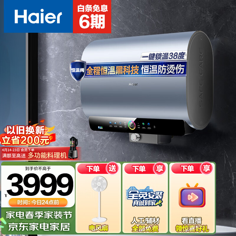 海尔(Haier)60升全程恒温超薄扁桶双胆家用电热水器大水量隐藏安装3000W速热免换镁棒一级能效 EC6003-WARM7U1价格:4399.00元!