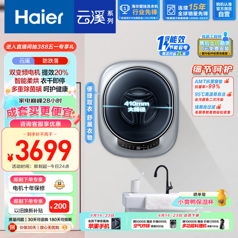 海尔(Haier)云溪系列 壁挂洗衣机 婴儿宝宝儿童洗衣机全自动 洗烘一体 内衣洗衣机 3公斤高温除菌99.99% 716U1价格:3699.00元!
