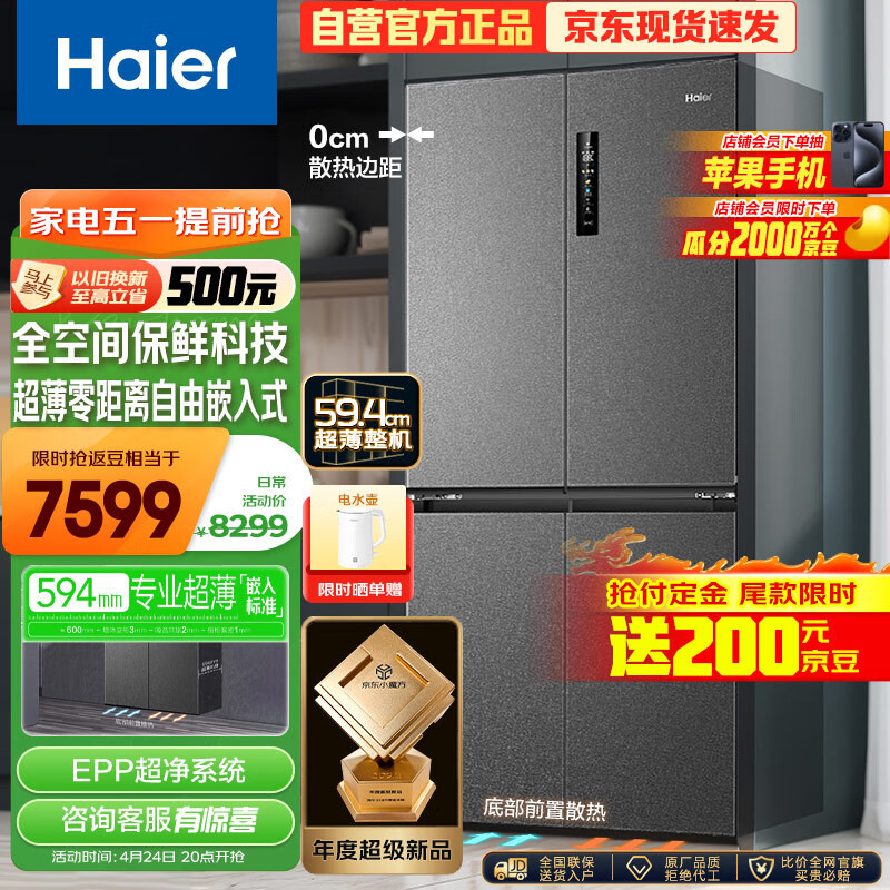 海尔(Haier)518L全空间保鲜超薄零嵌十字双开四开门家用电冰箱除菌超大容量嵌入式60cm以下BCD-518WGHTD1BSYU1价格:7799.00元!