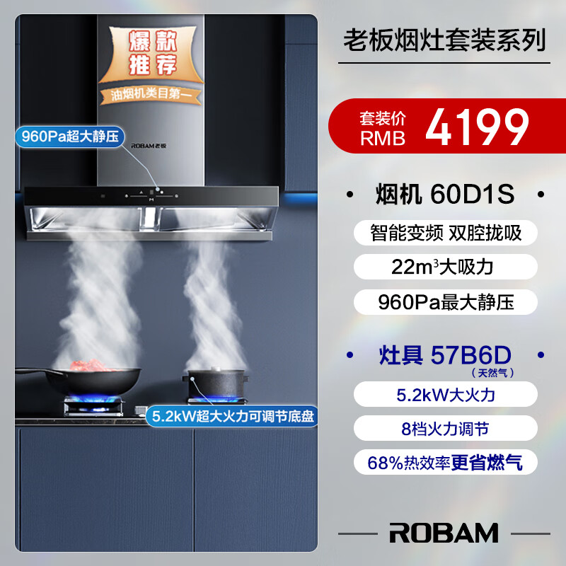 老板(Robam)抽油烟机 领航家D1S欧式22m3/min双腔聪明变频吸油烟机燃气灶家用烟灶套装60D1S+57B6D天然气价格:4199.00元!