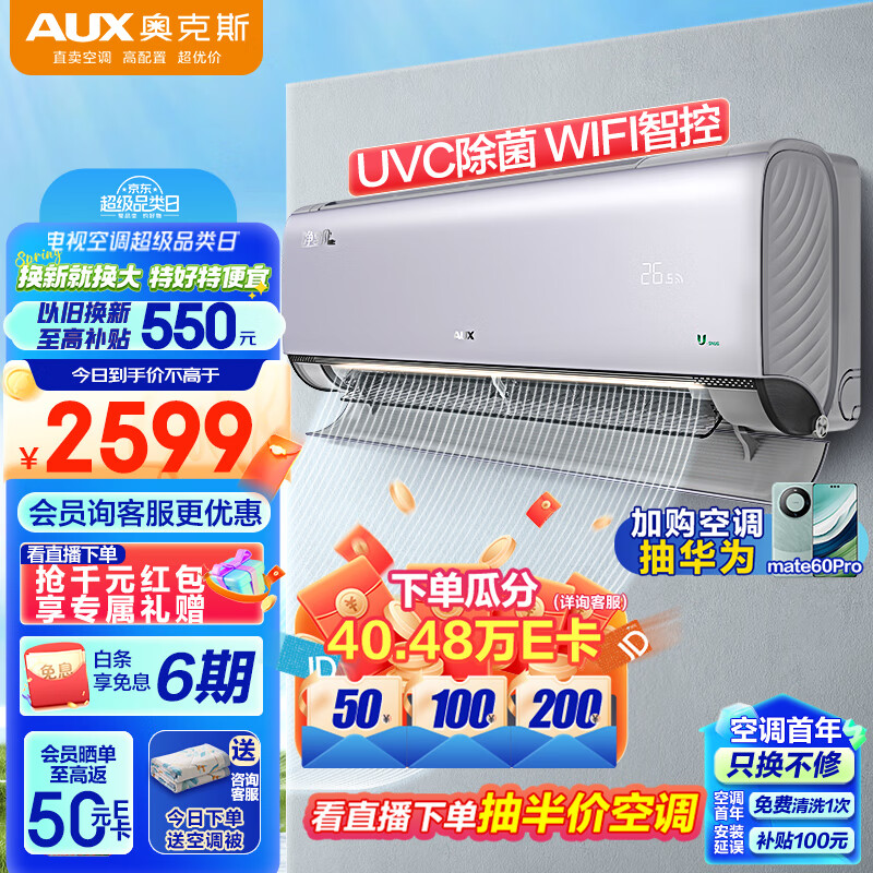 奥克斯(AUX)1.5匹净享风Pro+空调 新一级能效 家用冷暖壁挂式 紫外线除菌KFR-35GW/BpR3DQE1(B1)WiFi智控价格:2599.00元!