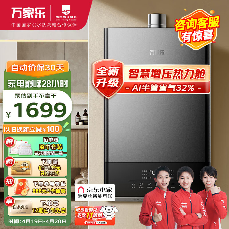 万家乐16升零冷水燃气热水器水气双伺服恒温APP智控智慧热力舱降噪天然气增压JSQ30-16DL1S京东小家价格:1699.00元!