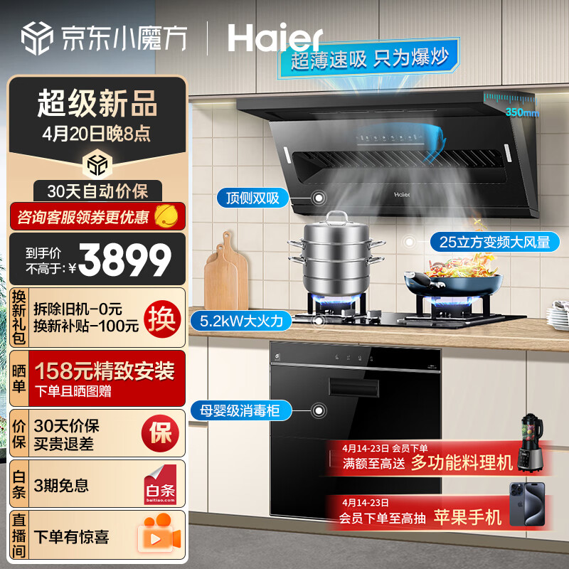 海尔(Haier)抽油烟机 顶侧双吸油烟机燃气灶消毒柜三件套 25m3/min大吸力 烟灶消套装C61+Q2BE3天+12LCS1价格:3899.00元!