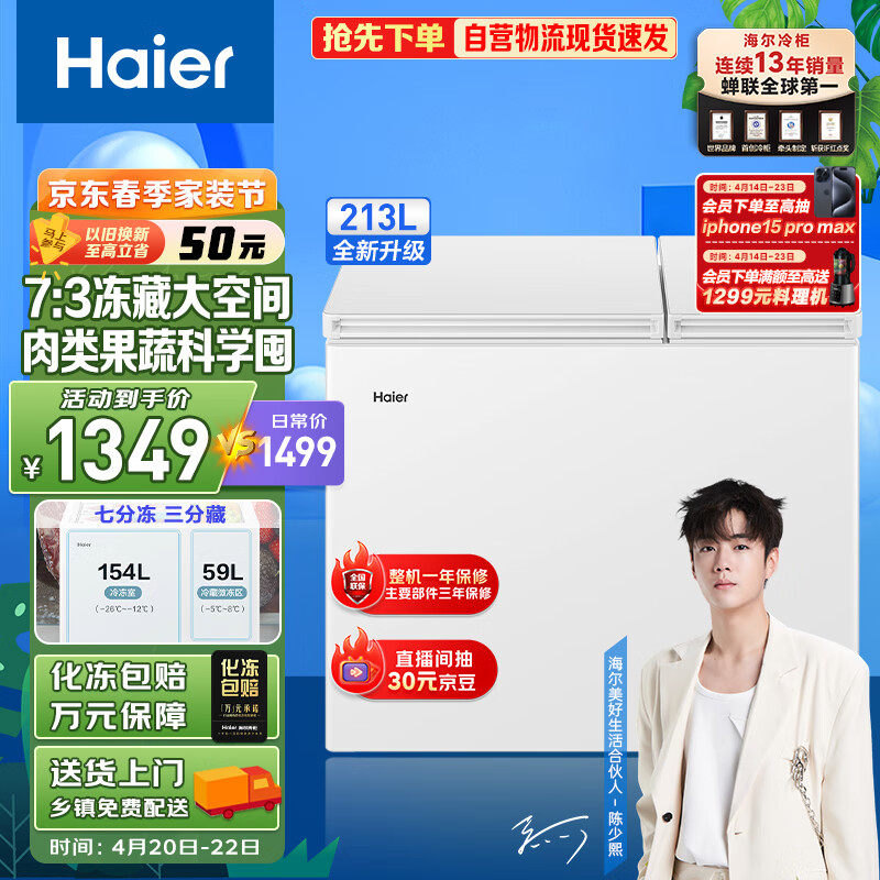 海尔(Haier)213升双箱双温商用家用冰柜 大冷冻小冷藏卧式冰柜家用小型冰箱冷柜FCD-213GHXZ 以旧换新价格:1349.00元!