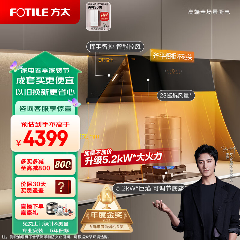 方太(FOTILE)抽吸油烟机灶具套装 侧吸式变频烟灶套装23大风量智能巡航挥手5.2kW燃气灶JCD10TA+02-TH27B天然气价格:4399.00元!