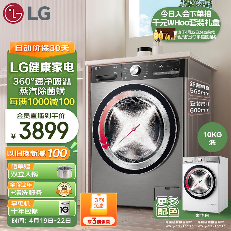LG小旋风系列 10KG超薄家用洗衣机全自动 自动脱水 旋风速净洗 蒸汽除菌 360°速净喷淋 银 FCW10Y4PA价格:4498.00元!