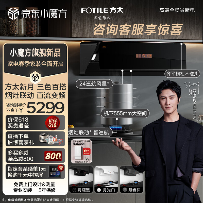 方太(FOTILE)新月抽吸油烟机灶具F1系列 家用侧吸变频24巡航风量烟灶联动01-F1A套餐天然气(三色可选)价格:5299.00元!