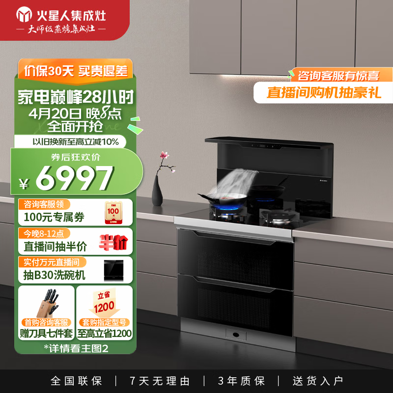 火星人集成灶【对标LJQ直播间】T30BX集成烹饪中心 侧吸式抽油烟机挥手控制 5.0kW燃气灶消毒柜天然气价格:7297.00元!