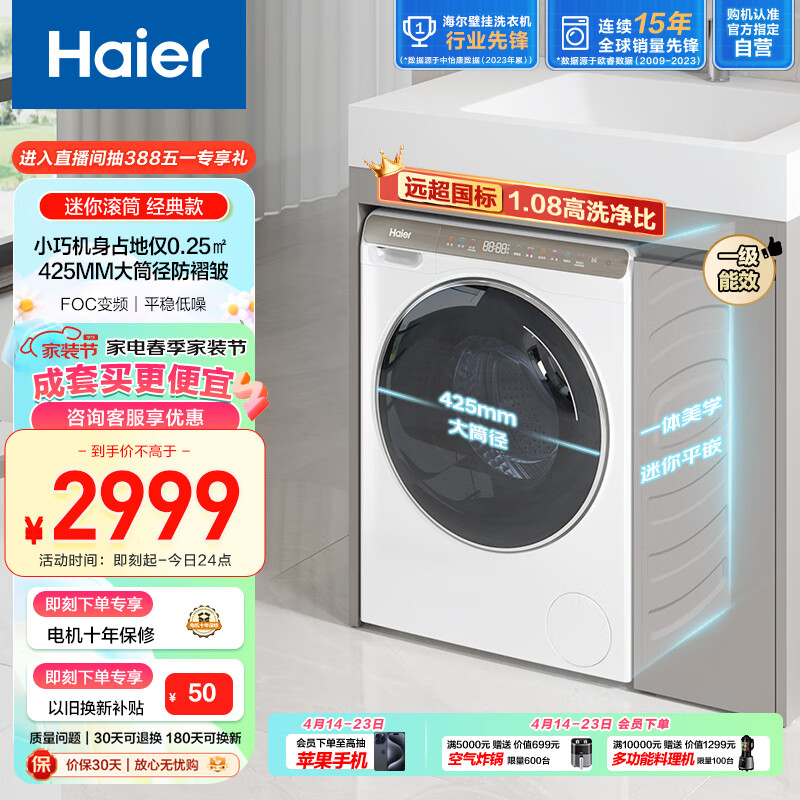 海尔(Haier)迷你滚筒洗衣机全自动 3.5KG超薄平嵌 儿童洗衣机婴儿洗衣机小型内衣洗95℃高温除菌XQGM35-B80CU1价格:2999.00元!