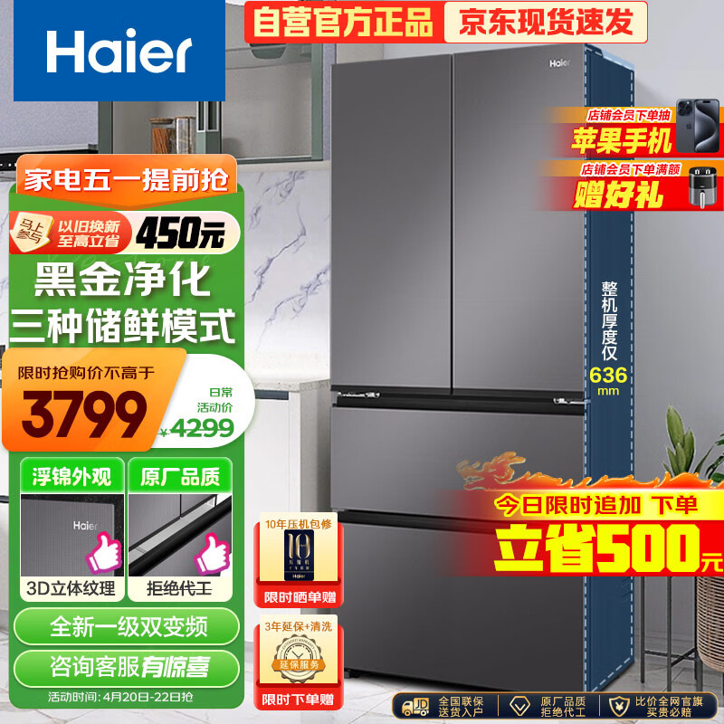 海尔(Haier)468升多门四开门法式电冰箱家用风冷无霜母婴一级能效变频超薄【510青春版】BCD-468WGHFD5DSMU1价格:3799.00元!